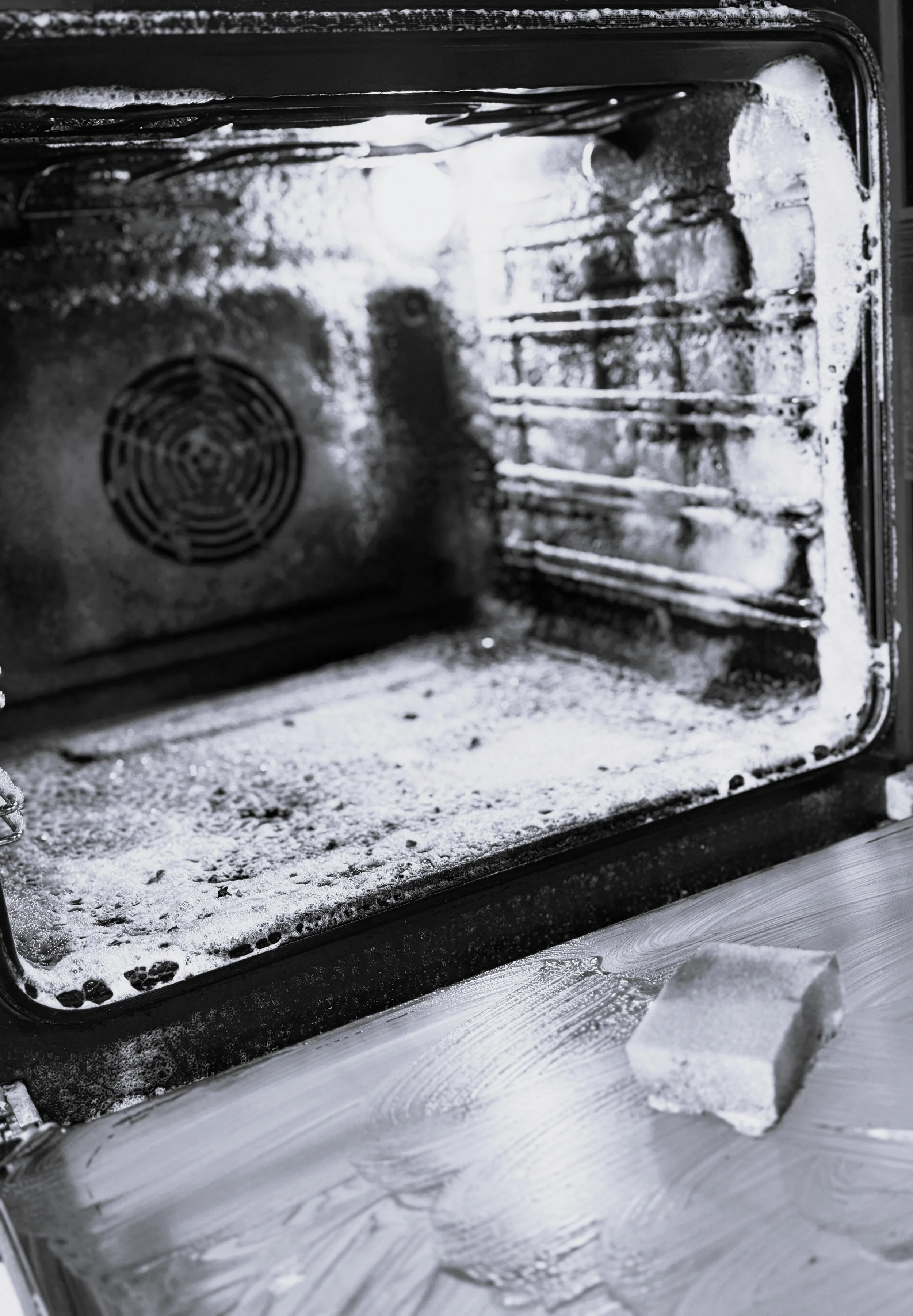 Sekoita ruokasoodaa ja vettä, kunnes muodostuu tahna. Levitä tahna uunin sisäpinnoille, erityisesti kohtiin, joissa on paljon rasvaa ja palanutta ruokaa.